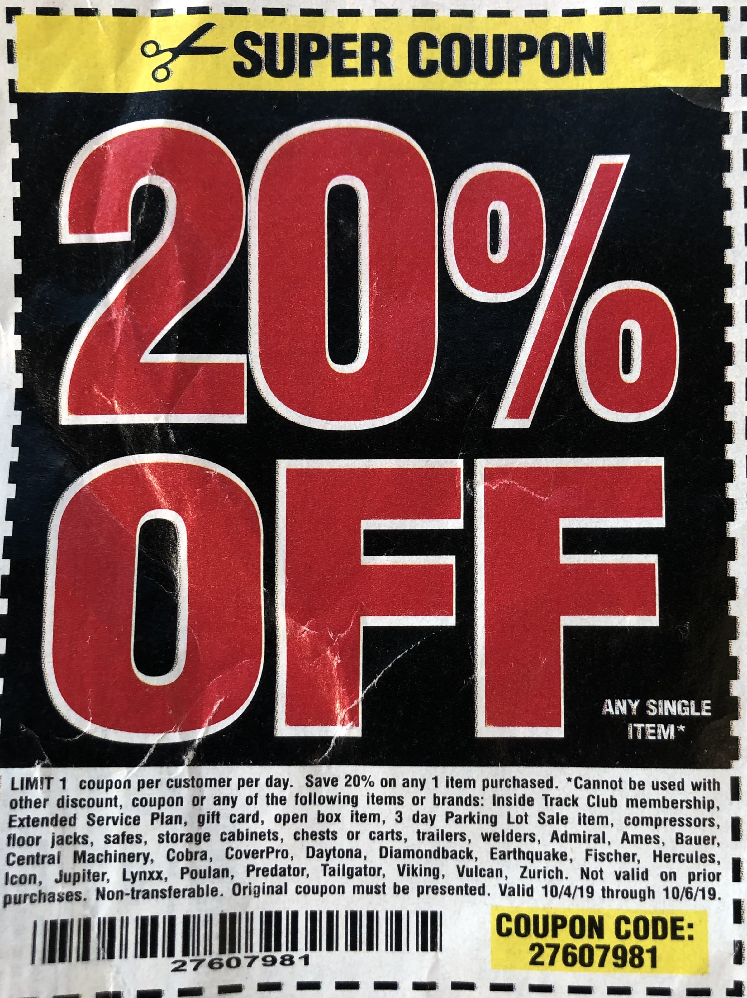 Harbor Freight Coupon Codes & Discount Codes | Save Up To ... 20% Off Any Single Item At Harbor Freight Using This Promotional Code Visit Store This deal is older, but may still work. Free LED Portable Worklight Flashlight With All Orders At Harbor Freight Using This Offer Code Visit Store This deal is older, but may still work. $20 Off 45 Watt Solar Panel Kit At Harbor Freight Using This Coupon Code