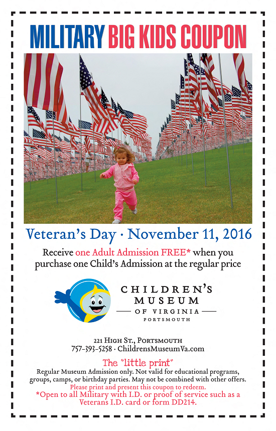 Membership - Children's Museum of Virginia Senior & Military Discount: 10% Membership discount for Seniors (62+) and Military (with I.D.). PURCHASE. Attention Portsmouth museum members! The Portsmouth ... Tickets & prices Children's Museum of Virginia - WhichMuseum The following overview lists the admission prices and various discounts and discount codes for a visit to Children's Museum of Virginia in Portsmouth.