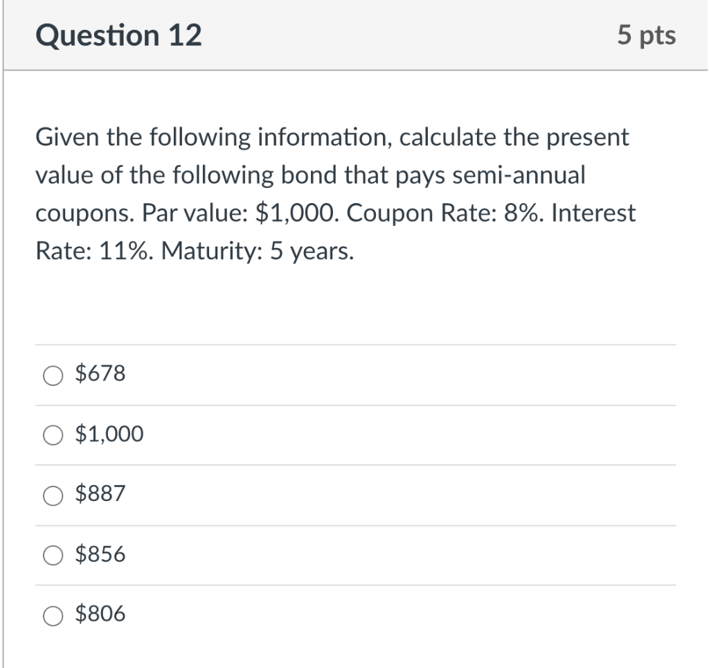 Bond Valuation: Calculation, Definition, Formula, and Example Present value of semi-annual payments = 25 / (1.015) 1 + 25 / (1.015) 2 + 25 / (1.015) 3 + 25 / (1.015) 4 = 96.36 Present value of face value = 1000 / (1.015) 4 = 942.18 Therefore, the value of the...