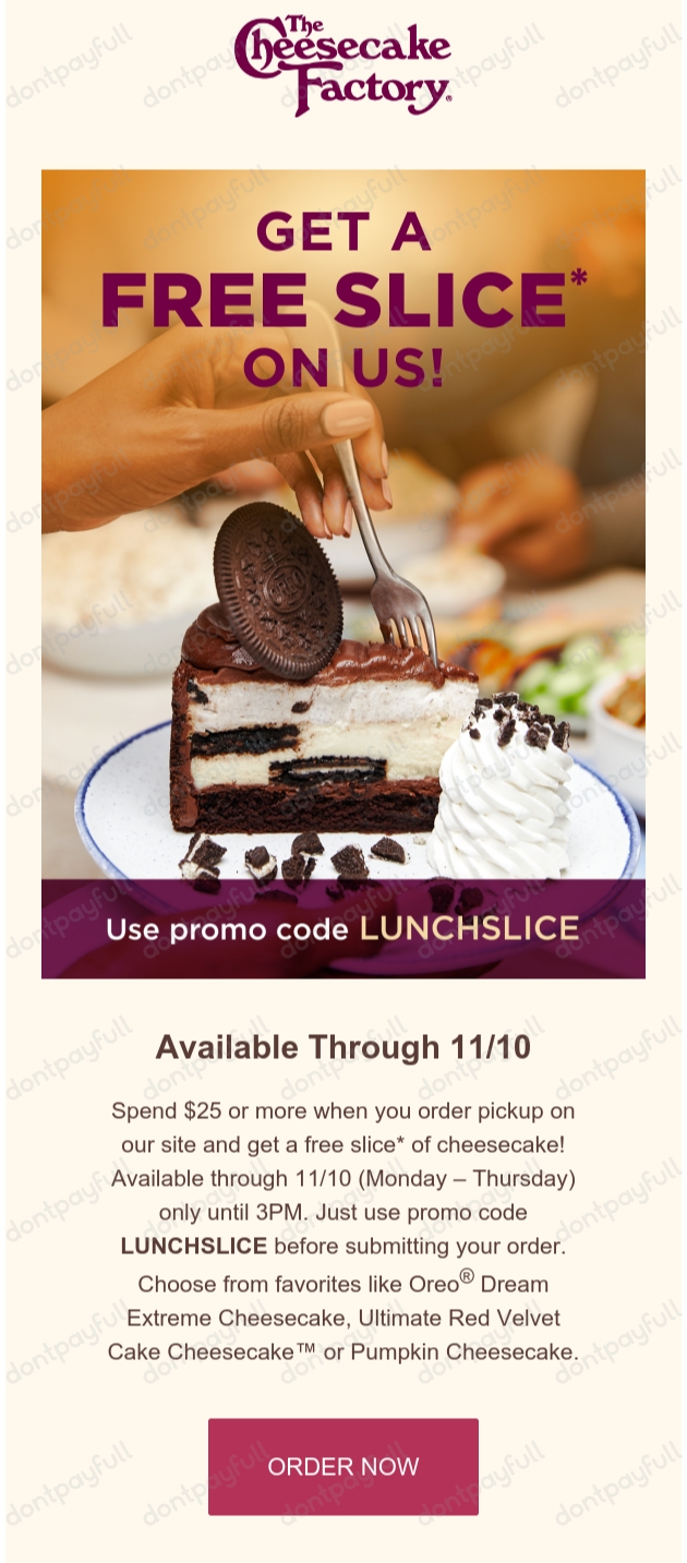 Last Day: The Cheesecake Factory Orders over $30 Free Slice ...