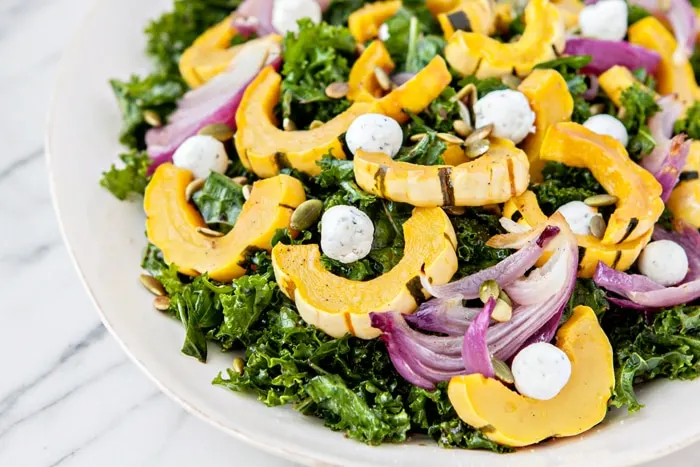 Sweet Potato and Kale Salad - Recipe Runner Cut the sweet potato into cubes, peeling it is your choice. Place them on a sheet pan and toss together in olive oil, salt, and pepper. Roast at 400° F. for 20 minutes or until fork tender. Make the tahini dressing - Combine the tahini, dijon, maple syrup, apple cider vinegar, salt and pepper, and cold water in a jar.